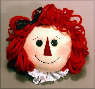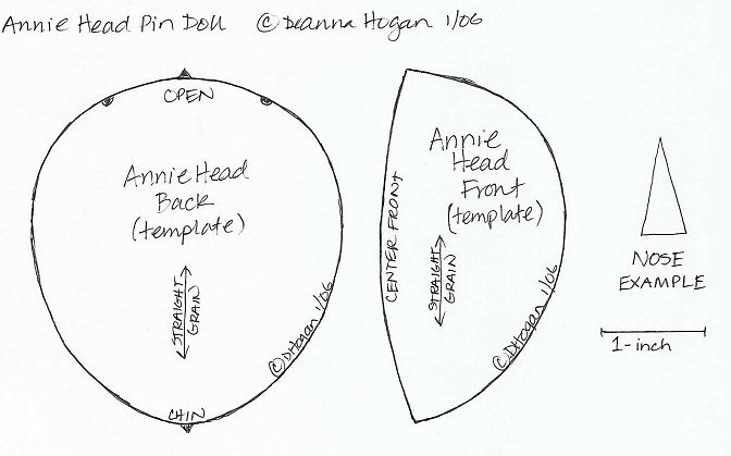 This is a fast and easy pin doll. The finished product is about five inches in diameter (including her hair). The design lends itself well to adaptation. Change her hair color and style. Make an ethnic Annie with brown skin, and use natural wool locks for hair. Change the shape of the nose and the position of the eyes for a different expression.