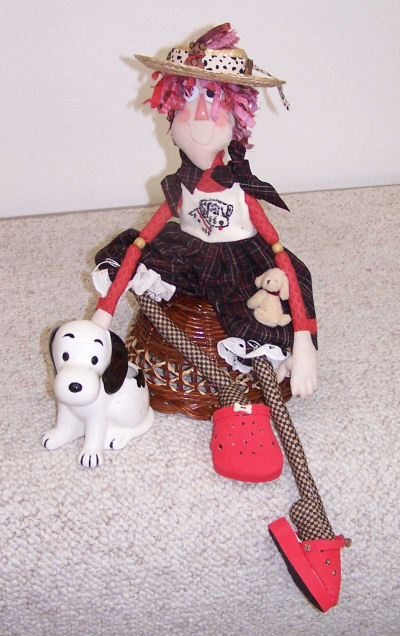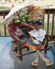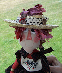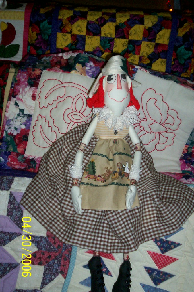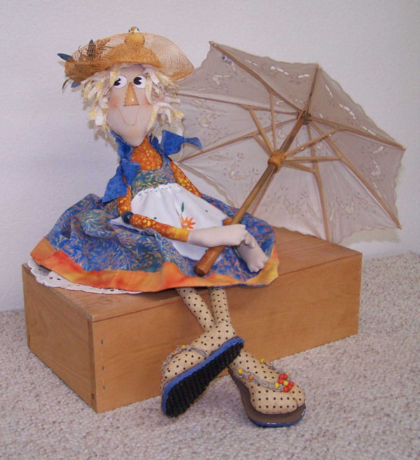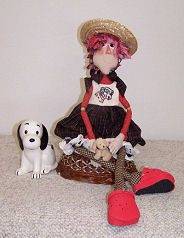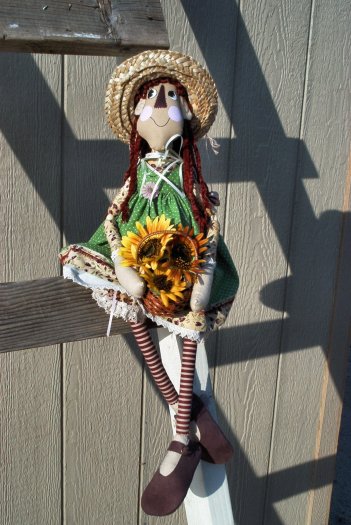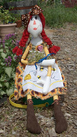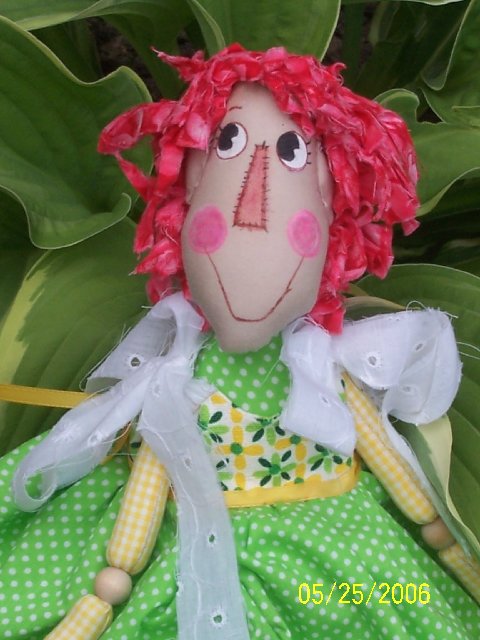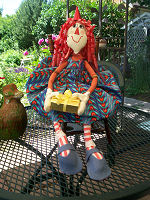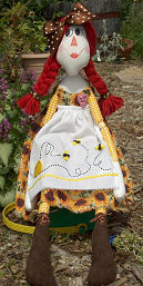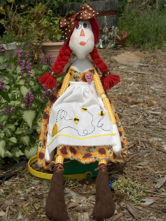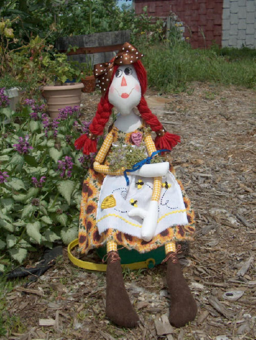 Lifebook, for the farmgirl in all of us while I was planning this doll, so Annie became a farmgirl to me. In one photo she is holding a bouquet of lemon thyme that “she” harvested. In the other, I tried to show the apron detail a little better. Her button heart says “Bee Happy”. She is wearing work boots instead of her leather slippers, as this is more appropriate for spending time in the dirt. This challenge has been a lot of fun! I don’t usually make raggedy dolls.