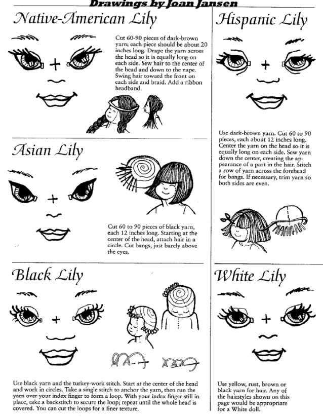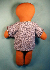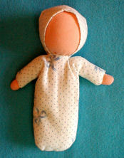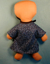 Narrow hem hospital gown sleeves and bottom, and sew double folded narrow bias tape around top and tie in the back. This gown would also make a cute dress, if you used Velcro on the back and added panties. The ethnic faces by Jean Jansen would work on both this doll and the Johns Hopkins doll. You could also paint the hair with black gloss paint (as in the Haiti dolls) or make yarn hair.