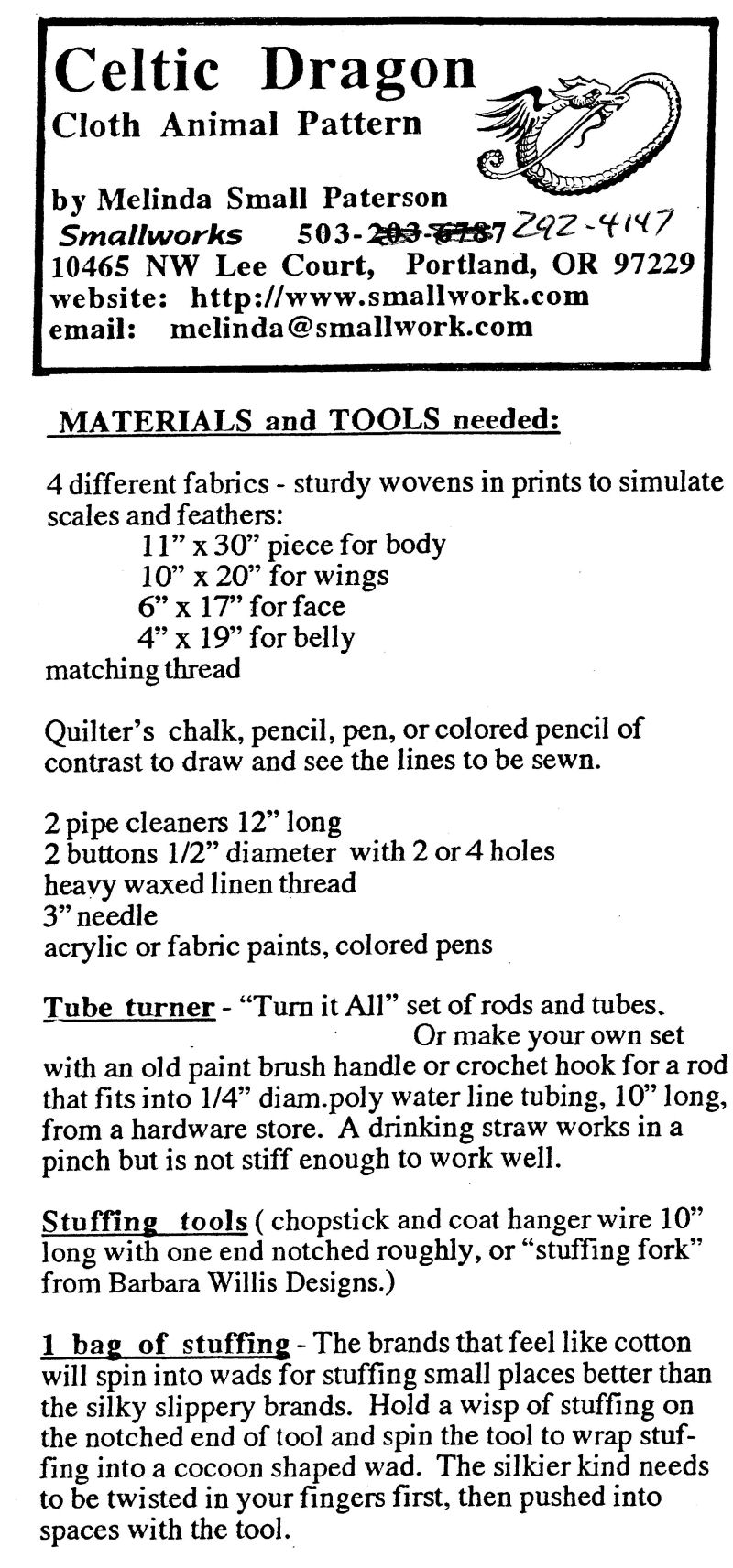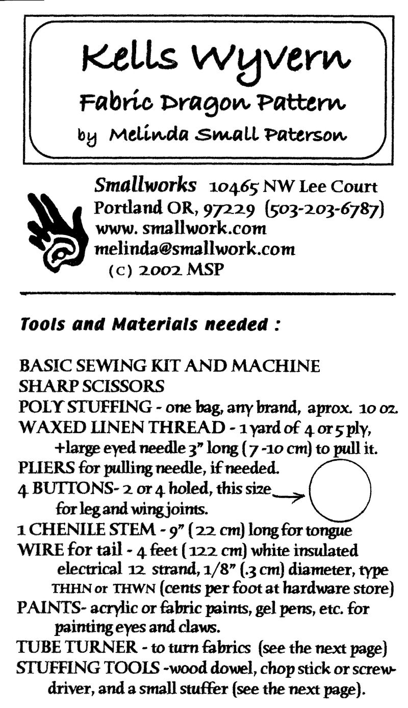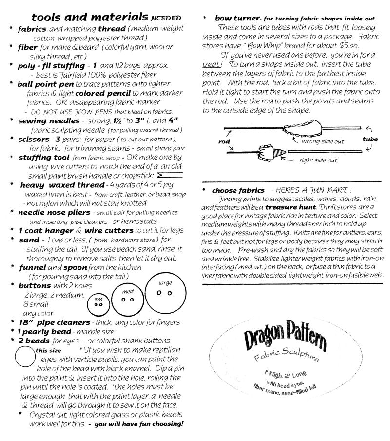 This Cloth Dragon project is unique among cloth sculpture patterns because it has detailed instructions and hand drawn illustrations to show the way through a logical series of parts to be made one at a time and then assembled into a finished figure.
