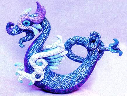 This 20" long serpent-bird was derived from the knotwork art in the Irish Book of Kells. It's dog-like face is a mask made with trapunto quilting methods as a separate piece which is sewn to the body. Easier to make than the original dragon, it features painted eyes and claws, wired tongue, cloth teeth and 36" wired tail to bend in any shape you wish.