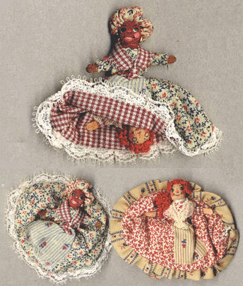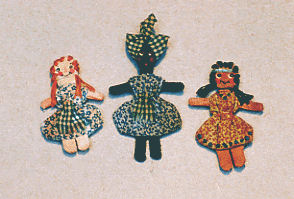 Kit includes materials and instruction to complete 3 miniature dolls. Styles include Native American, African American, and Raggedy Ann.