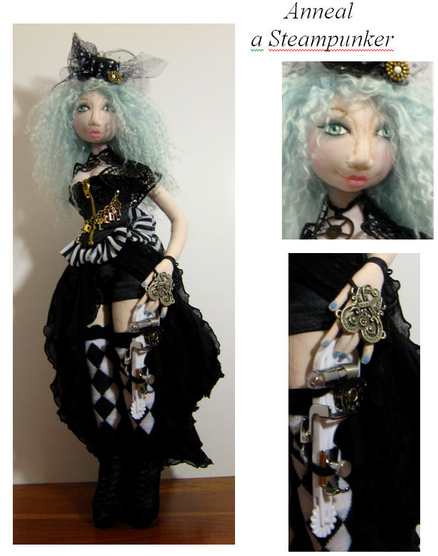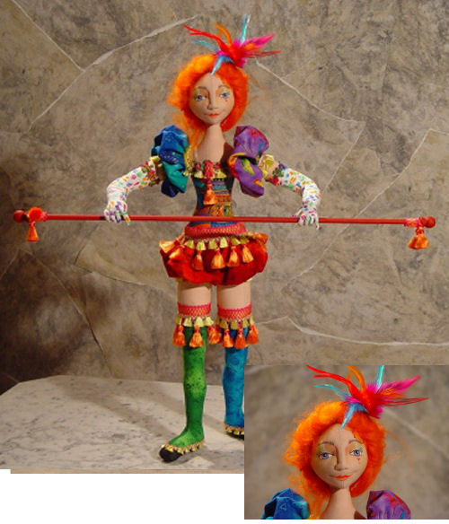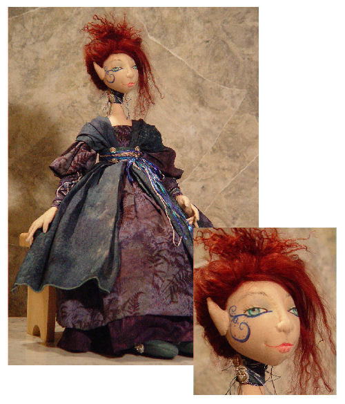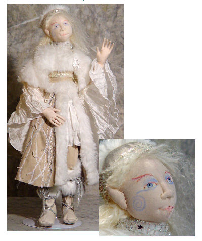 This beautifully costumed 18" creature has hidden bead jointing and articulated hands.